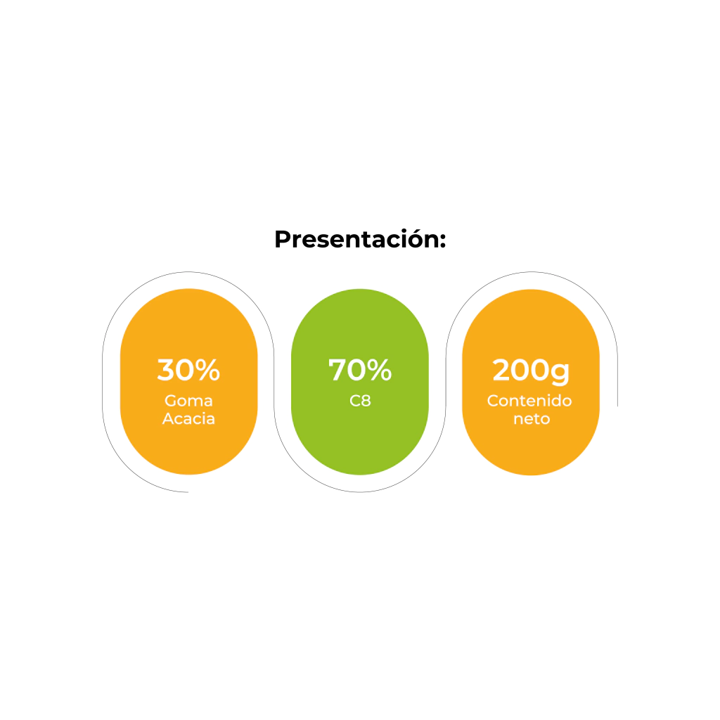 Este polvo combina Goma Acacia con Triglicéridos de Cadena Media derivados de ácidos grasos C8 puros.